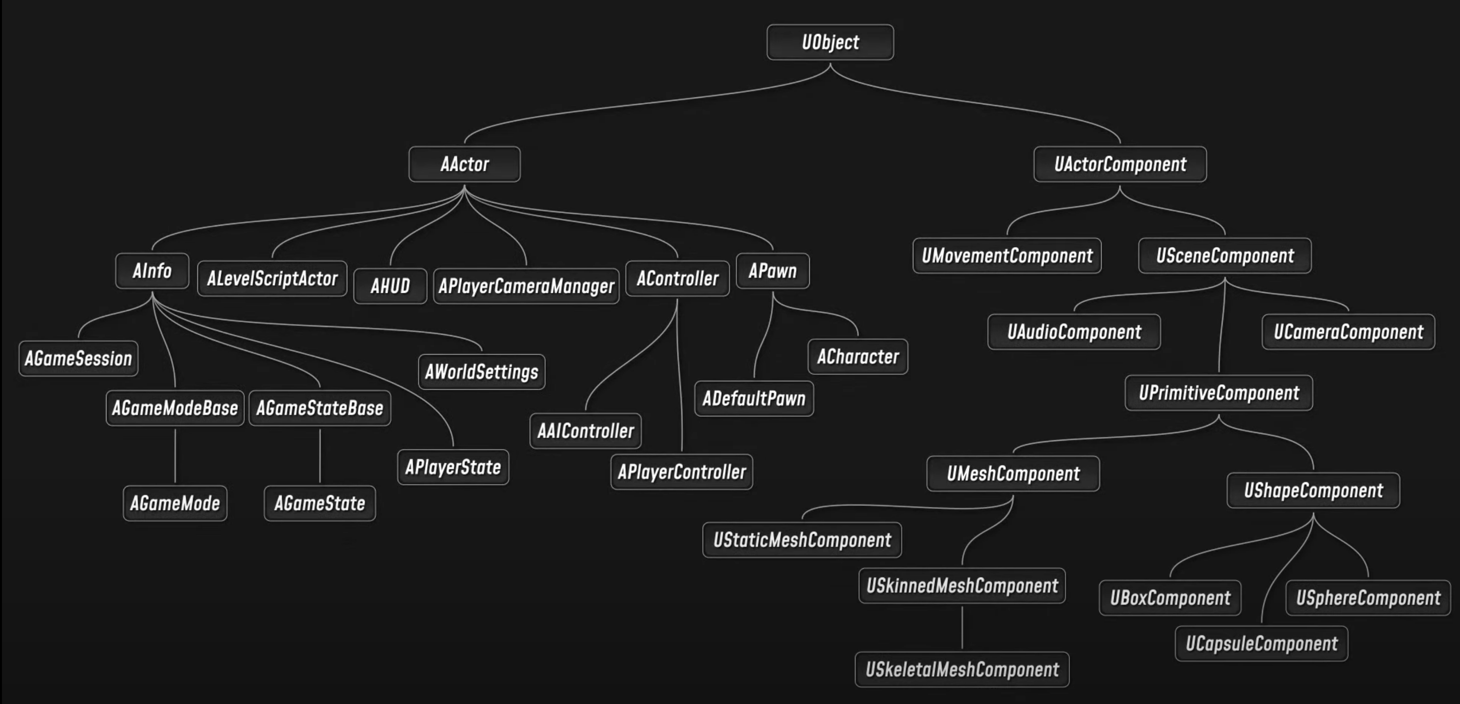 액터 컴포넌트는 재사용가능한 기능을 정의하는 컴포넌트에 대한 베이스 클래스로 충돌, 메시, 월드 이동, 소리 재생, 빛과 명암 등의 다양한 기능을 지원한다. 언리얼에서는 트랜스폼을 가진 액터 컴포넌트를 씬 컴포넌트(Scene Component) 라고 하며, 렌더링 가능한 것은 (Primitive Component) 라고 한다.