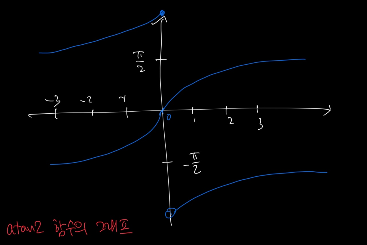 일반적으로 arctan 함수를 이용하면 벡터의 각도를 얻어낼 수 있는데(tanθ = y/x 이므로, θ = arctan(y/x) 이 됨), arctan 함수는 치역이 -180도에서 180도까지 밖에 되지 않는다. 따라서 이를 해결하기 위해, x 와 y 값을 따로 전달하는 arctan 함수인 atan2 함수가 있다. 인자에 y/x 를 한번에 전달하면 해당 벡터가 어떤 사분면에 위치해 있는지 정확히 파악할 수 없지만, atan2 함수는 x 와 y 를 따로 전달하므로 벡터의 각도를 정확히 측정할 수 있다.