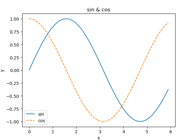 추가로, cos() 함수도 그려보자. 그리고, 제목과 각 축의 이름(레이블) 표시 등, pyplot의 다른 기능도 사용해 보자.
