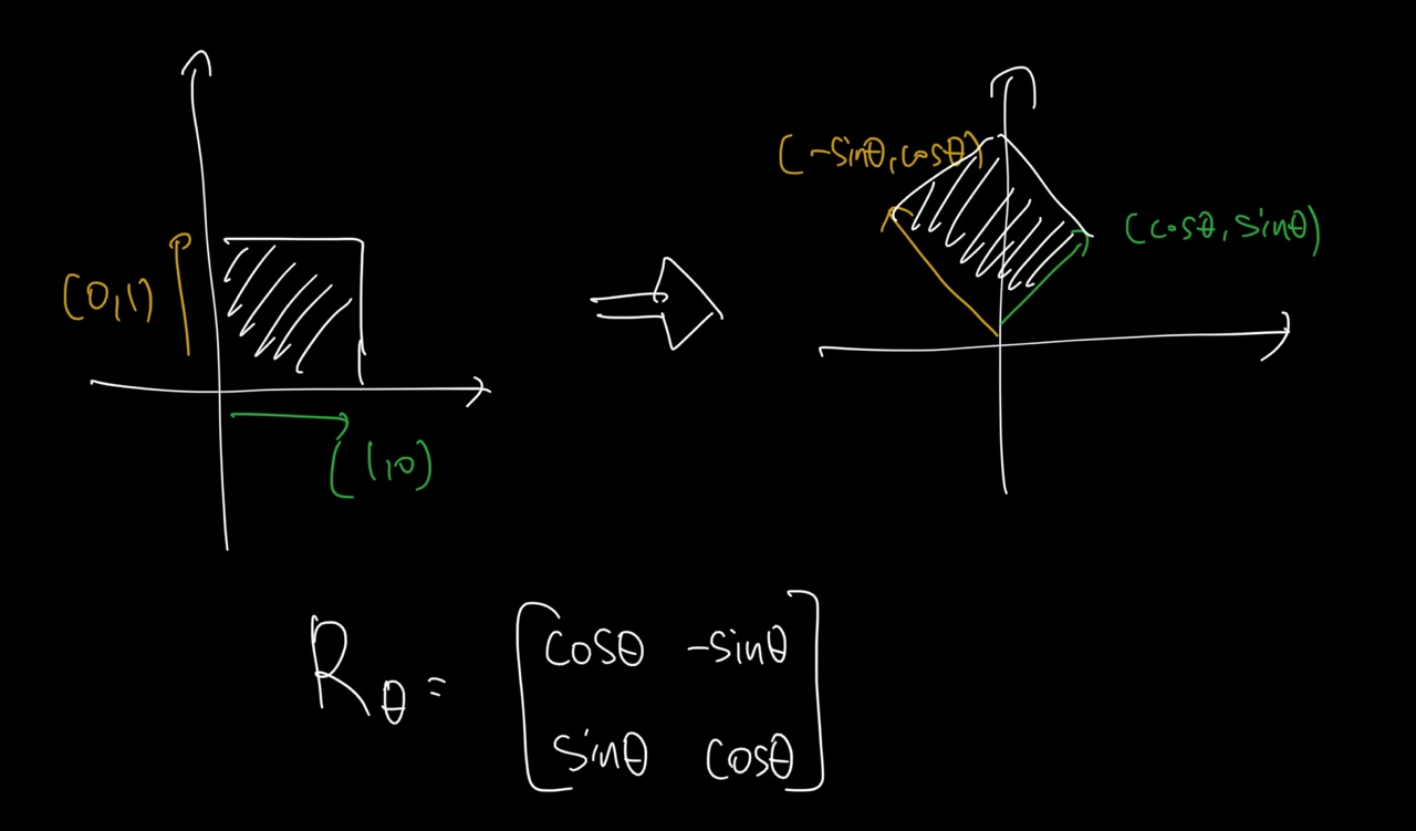 그렇다면 주어진 각도 θ 로 벡터 공간을 회전시키는 회전 변환 행렬을 구해보자. 위와 마찬가지로, 표준기저벡터가 어떻게 변하는지만 추적하면 된다!
