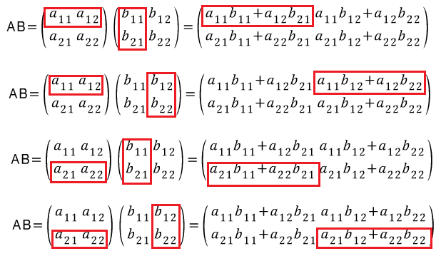 행렬의 곱은 위처럼 왼쪽 행렬의 행(가로)과 오른쪽 행렬의 열(세로)을 원소별로 곱하고 그 값들을 더해서 계산한다.