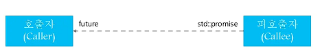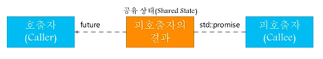 그런데 해당 미래 객체를 호출자와 피호출자에 저장하는 것은 적절치 못하다(피호출자의 경우, 완료되면 std::promise 가 파괴되고, 호출자의 경우, 전달받은 해당 std::future 이 또다른 호출자에게 사용될 수 있음). 따라서 공유 상태(shared state) 라고 부른는 제 3 의 장소에 미래 객체의 결과를 저장한다.