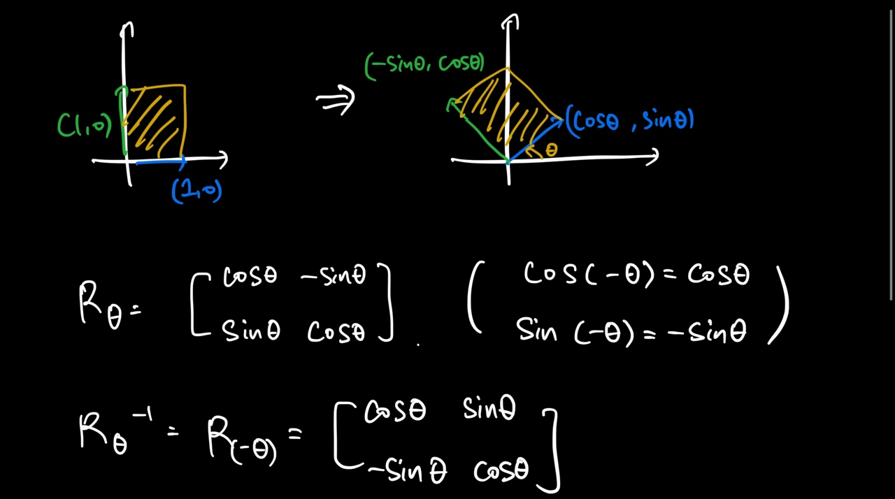 회전 변환행렬의 역행렬은 다음과 같다. θ 만큼 반시계 방향으로 회전시키는 행렬의 역행렬을 구하기 위해서는, -θ 만큼 반시계 방향으로 회전시키는 행렬을 생각해보면 된다! 삼각함수의 성질을 이용하면 간단히 구할 수 있다.