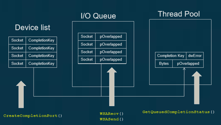 - I/O 디바이스(소켓, FD) IOCP 에 등록 : CreateIoCompletionPrt 함수를 통해 디바이스와 CompletionPort(이하 CP) 를 바인딩한다. 이 함수는 CP 의 핸들을 반환하는데, 앞으로의 작업에서 이 핸들을 이용할 것이다.