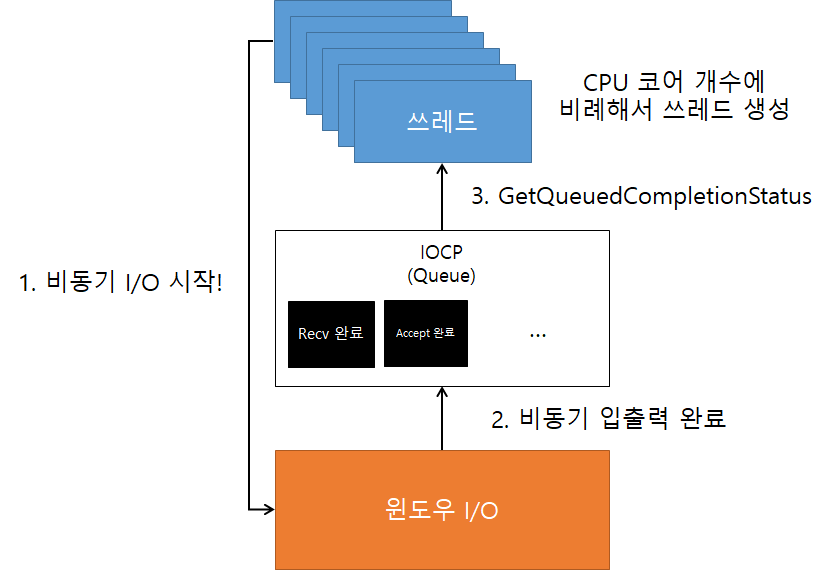 - 비동기 입출력 완료 : 비동기 입출력이 윈도우 I/O 가 종료되면 IOCP 라는 항구(Port) 에 쌓이게 되는데, 이 자료구조는 Queue 이다.