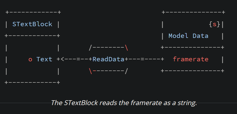즉 STextBlock 이라는, 어떤 텍스트를 표시하는 슬레이트가 있다고 했을 때, Text 를 Model Data 의 framerate를 읽어 표시해준다고 가정하자. 이때 데이터를 UI 에 직접 표시해줄 수도 있겠지만, 그것보다는 델리게이트를 하나 만들어 주어서, STextBlock 이 해당 Text 를 불러올 필요가 있을 때 바인딩된 델리게이트가 호출되도록 만들 수 있을 것이다.