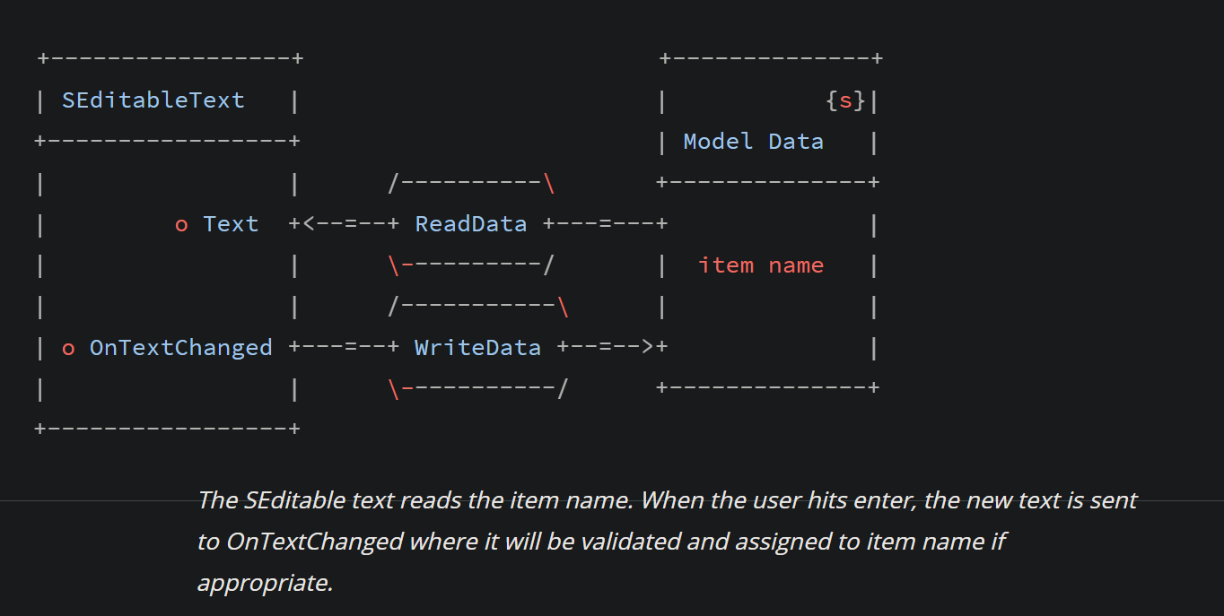 사용자가 SEditableText 라는 슬레이트를 통해 특정 item name 이라는 데이터를 수정하고 싶다면, OnTextChanged 라는 함수에 연결된 델리게이트가 실행되어 Model Data 의 item name 데이터가 수정되게 될 것이다(다음 틱에)!