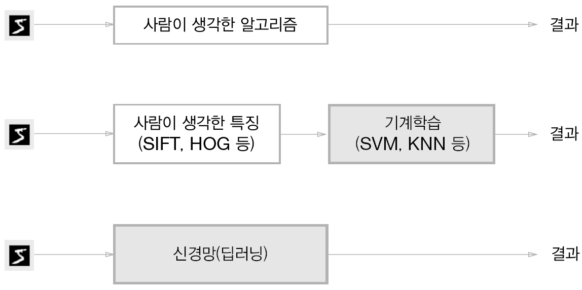 위와 같은 기계학습에서는 데이터셋으로부터 규칙을 찾아내는 역할을 '기계'가 담당한다. 하지만 이미지를 벡터로 변환할 때 사용하는 특징은 여전히 '사람'이 설계한다.