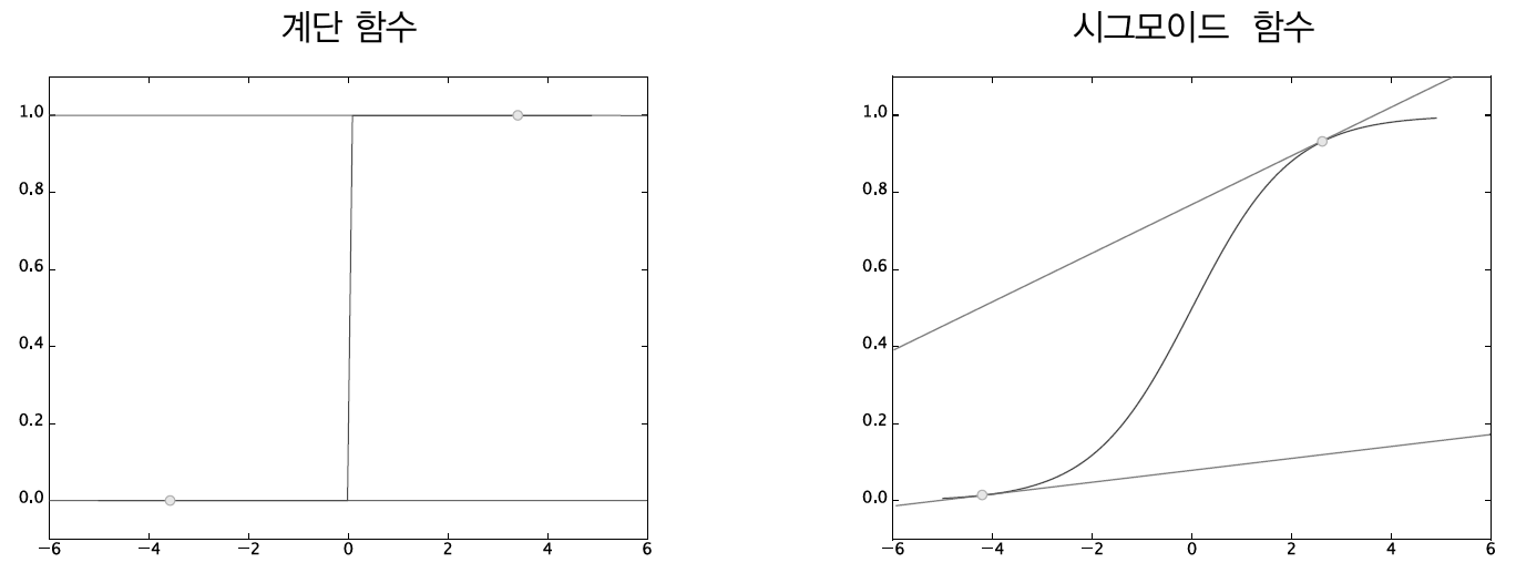 계단 함수는 한순간만 변화하지만, 시그모이드 함수의 미분(접선)은 출력이 연속적으로 변하고 곡선의 기울기도 연속적으로 변한다. 즉, 시그모이드 함수의 미분(기울기)은 어느 장소라도 0이 되지 않으므로, 신경망이 올바르게 학습할 수 있는 것이다!