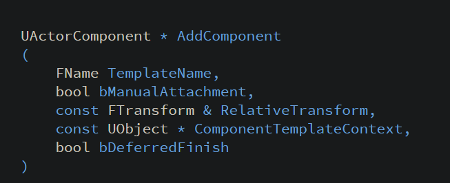UActorComponent* AddComponent(FName TemplateName, bool bManualAttachment, const FTransform& RelativeTransform, const UObject* ComponentTemplateContext, bool bDeferredFinish = false);