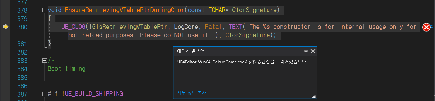 UE_CLOG(!GIsRetrievingVTablePtr, LogCore, Fatal, TEXT("The %s constructor is for internal usage only for hot-reload purposes. Please do NOT use it."), CtorSignature);