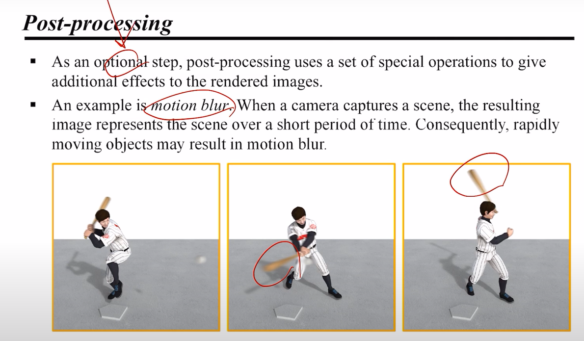 선택사항이긴 하지만, post-processing 작업이 때론 필요하기도 하다. 위처럼, 야구 선수가 배트를 빠르게 움직이는 경우, 배트에 모션 블러를 주어 배트의 속도감을 표현하면 더 사실적인 렌더링이 가능할 것이다.