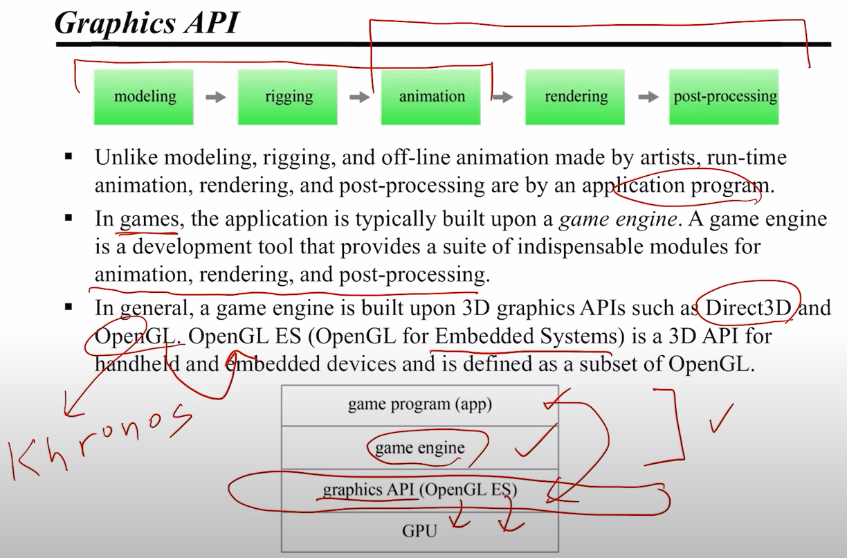 게임 엔진은 일반적으로 Direct3D 나 OpenGL 같은 그래픽스 API 위에서 돌아간다(OpenGL ES 는 Embedded System 을 위한 OpenGL 임, Khronos 등이 있다). 이러한 그래픽스 API 는 GPU 를 가동하는데 필요한 Software Interface 라고 이해하면 된다!
