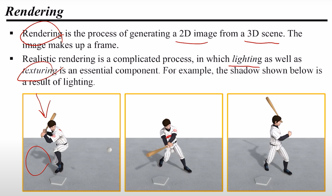 렌더링은 3D 씬으로부터 2D 이미지를 만들어내는 과정이다. 실제와 같은 렌더링을 위해서는 라이팅과 텍스쳐링(Fragment Shader 가 담당함)이 필수적이며, 섀도잉도 필요하다(강의 최후반부에 다룰 것이다).