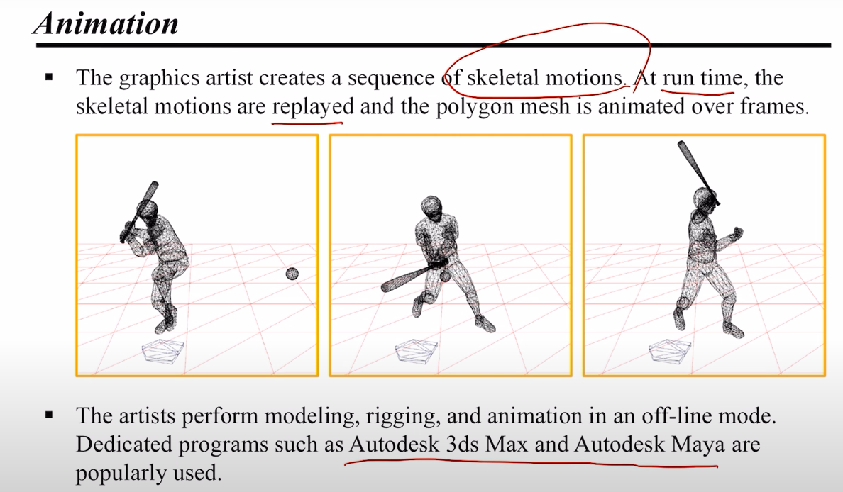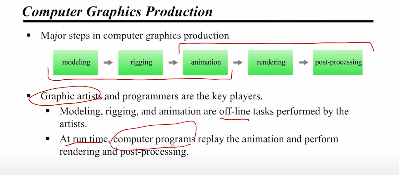 컴퓨터 그래픽스의 연산은 오프라인과 런타임으로 나뉘는데, modeling 과 rigging, animation 처리는 그래픽 아티스트들이 오프라인에서, rendering 과 post-processing 은 컴퓨터 프로그램이 런타임에 연산한다. 물론 animation 재생도 런타임에 동작한다.