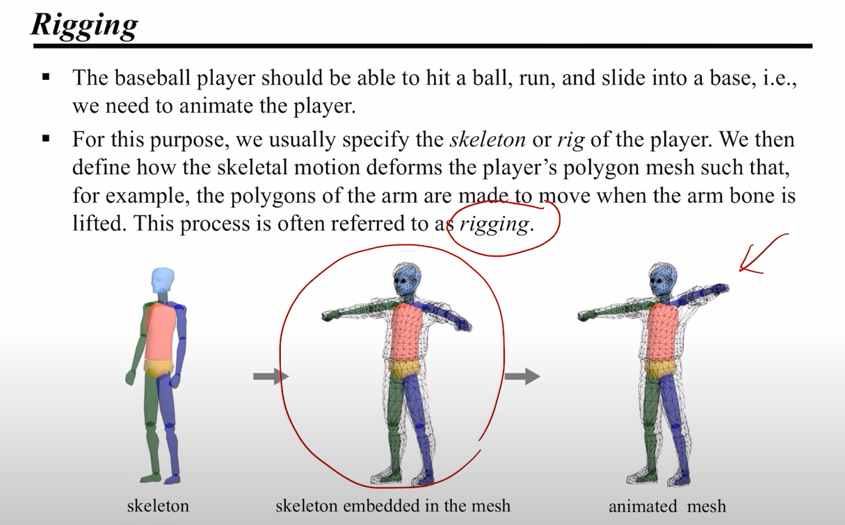 그래픽 디자이너는 rigging 을 통해 특정 스켈레톤이 움직였을 때 플레이어의 폴리곤 메시가 어떻게 변할지를 정의한다.