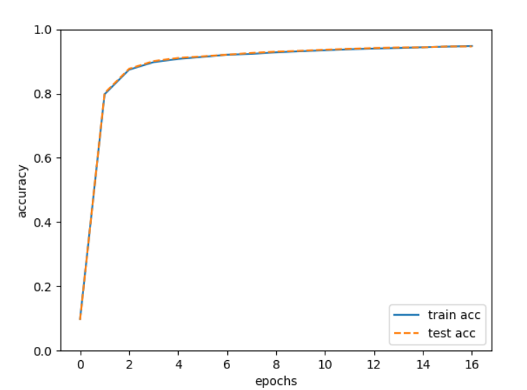 훈련 데이터에 대한 정확도를 실선으로, 시험 데이터에 대한 정확도를 점선으로 표시했다. 에폭이 진행될수록 훈련 데이터와 시험 데이터를 사용하고 평가한 정확도가 모두 좋아지고 있으며, 두 정확도에는 거의 차이가 없음을 알 수 있다.