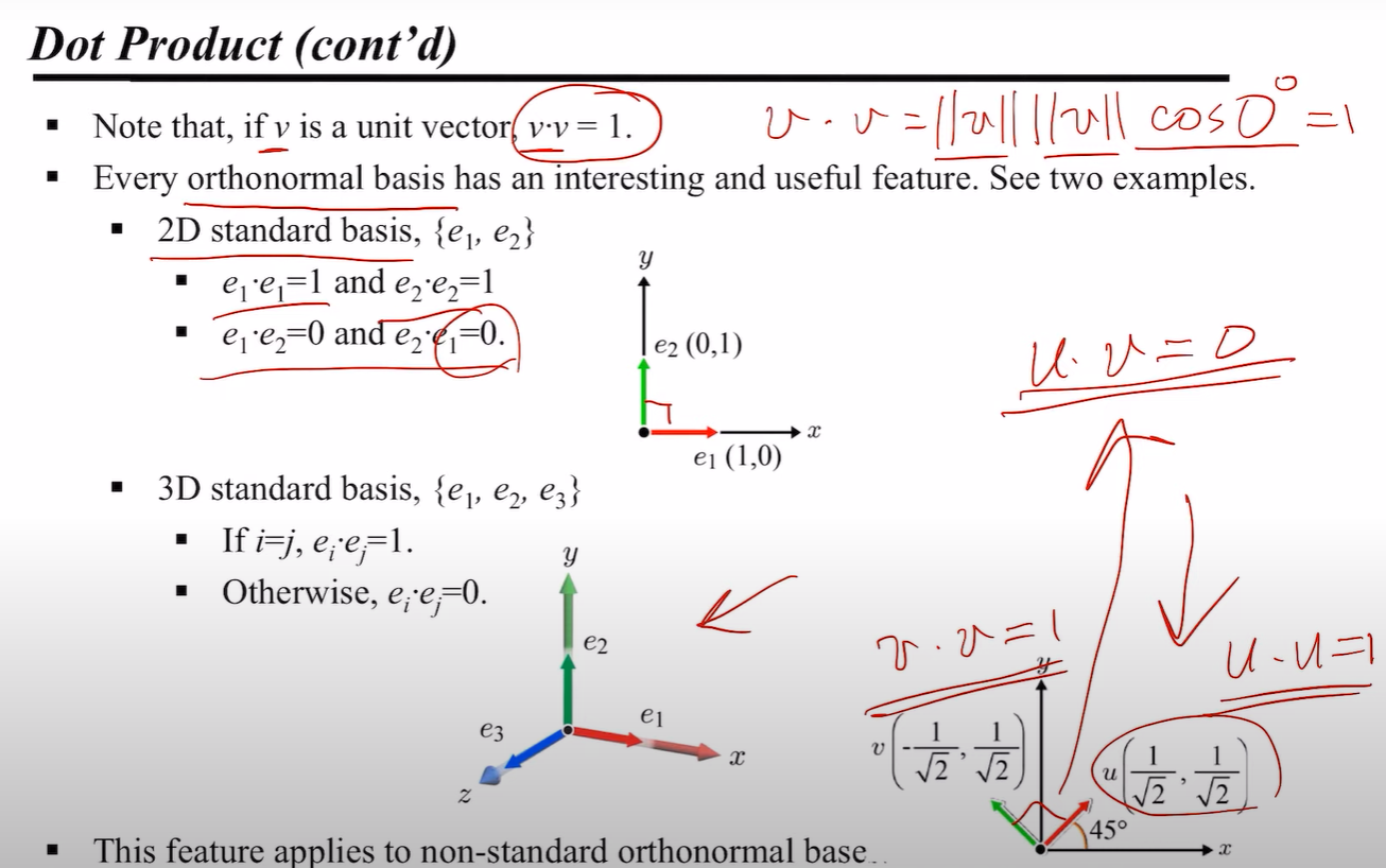 한 가지 더 재미있는 성질은, 기저 벡터끼리의 곱이 같은 녀석일 때는 1, 아닐 때는 0이 나온다는 사실이다. 이는 non-standard 한 orthonormal base 에서도 동일하게 적용되는 성질이다.