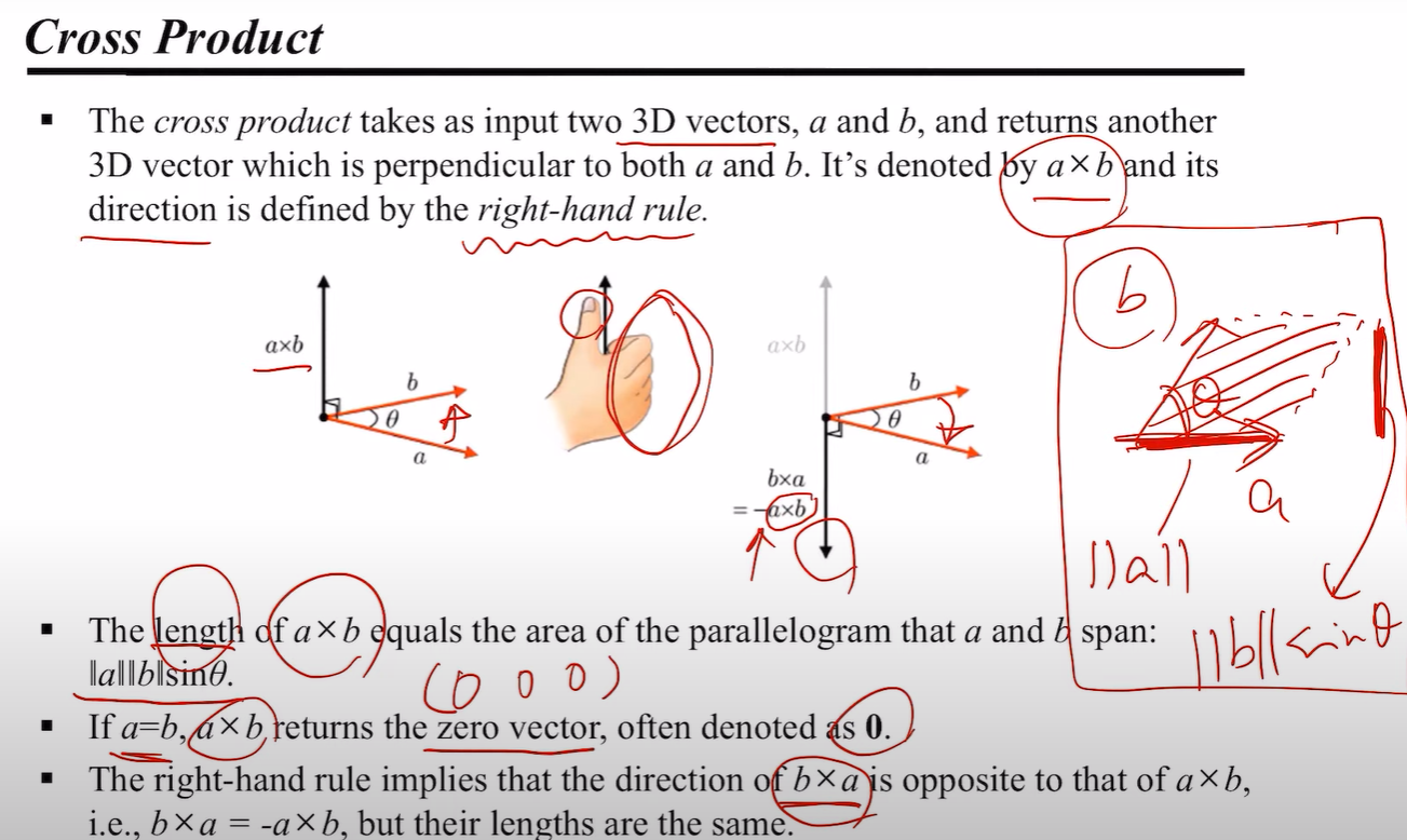 3. 외적의 경우, 오른손 법칙으로 방향을 구할 수 있다. 외적의 절댓값은 두 벡터가 만드는 평행사변형의 넓이이다.