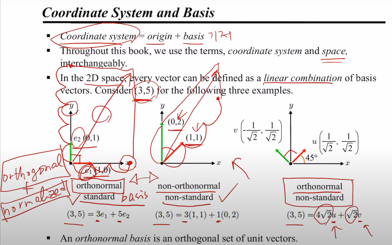 좌표계는 원점(origin)과 기저(basis) 로 이루어진다. 위의 그림에는 2D 공간을 이루는 기저 벡터의 조합이 나와 있는데, 그 중 orthonomal basis 를 자주 이용하게 될 것이다. orthonormal basis 는 orthogonal(직교) 하면서 normalized(크기가 1인)된 기저 벡터를 의미한다.