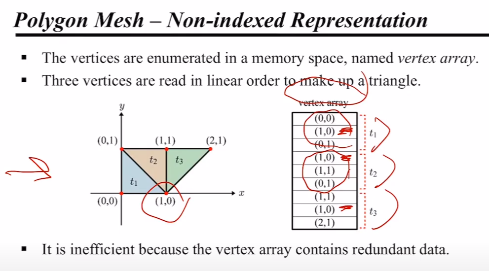 하지만 위 방법을 사용하면, 폴리곤 메시들이 공통으로 사용하는 꼭짓점들이 중복해서 저장된다는 단점이 있다.