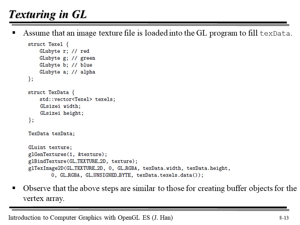 Vertex Buffer 를 만들 때 Generate -> Bind -> Data 제공의 스텝을 밟은 것처럼, Texturing 도 마찬가지의 흐름을 탄다.