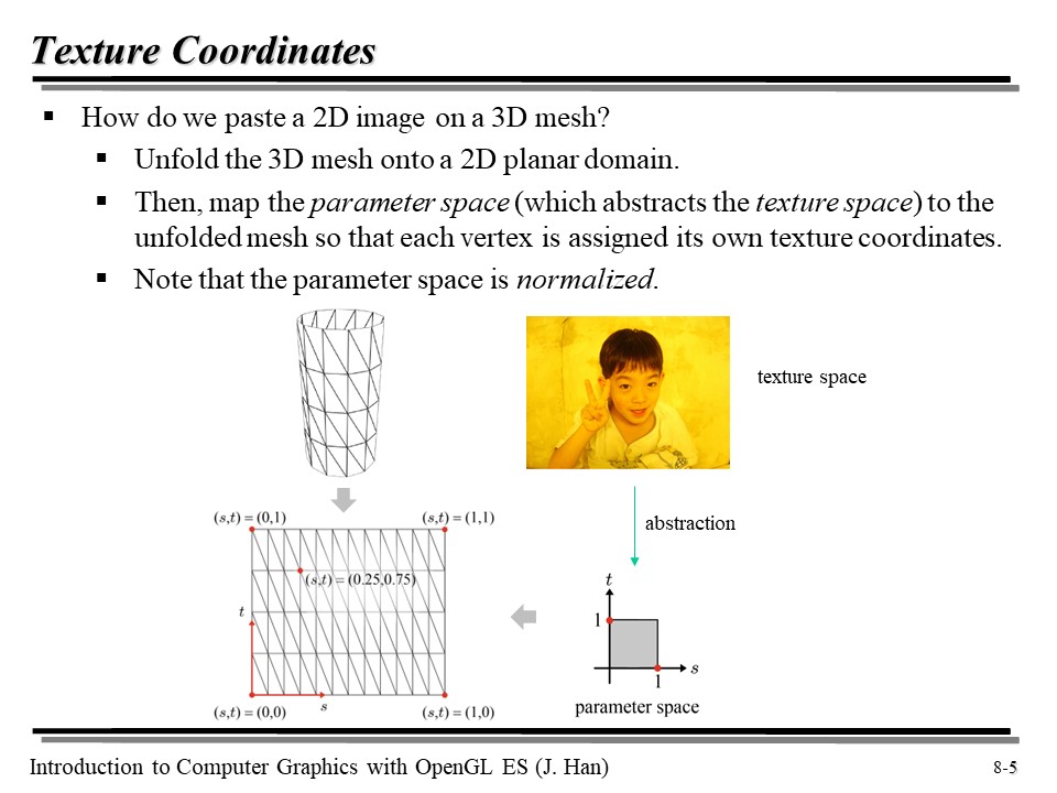 2. 텍스쳐링을 위해, 텍스쳐 공간을 normalize 시키게 되는데, 이때의 결과를 Texture Coordinates 라고 부른다. 1 값을 벗어나는 공간을 처리하는 방식으로는 Clamp-to-Edge, Repeat, Mirrored-Repeat 등이 있다.