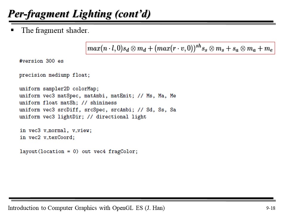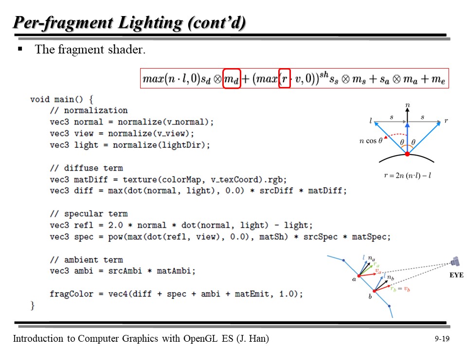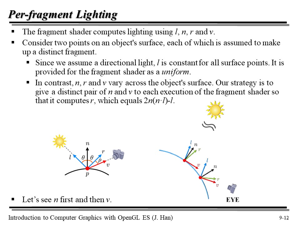 반면, 각 점마다 n, r, v 는 다르다. 따라서 우리는 n 과 v 의 조합을 Fragment Shader 에게 전달할 것이다. r 같은 경우, n 과 l 로 표현이 가능하다는 것을 앞서 증명한 바 있다! 😆
