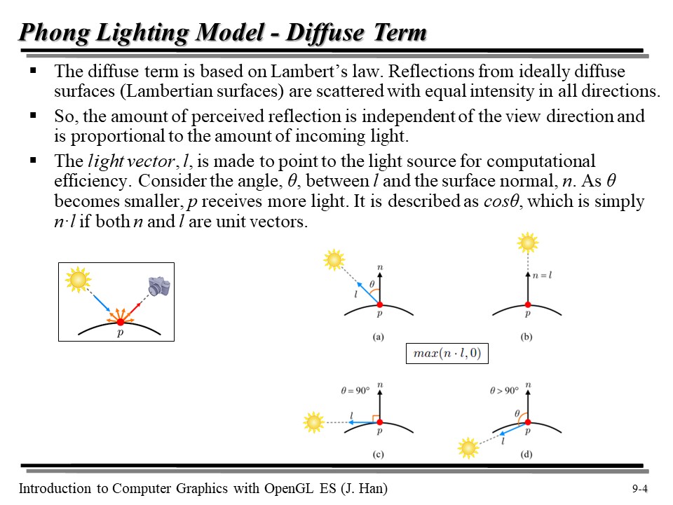 태양 빛이 점 p 로 들어오는 상황을 보자. 이때, l 을 태양 방향으로의 벡터, n 을 노말 벡터라고 하자. 그럼 l 과 n 의 각도 θ 에 따라 들어오는 빛의 양을 계산할 수 있다. θ 가 작아질수록, 즉 cosθ 값이 작을수록 빛을 많이 받게 될 것이다. n 과 l 이 unit vector 일 경우, 이를 그냥 n ⋅ l 로 표현할 수도 있다.