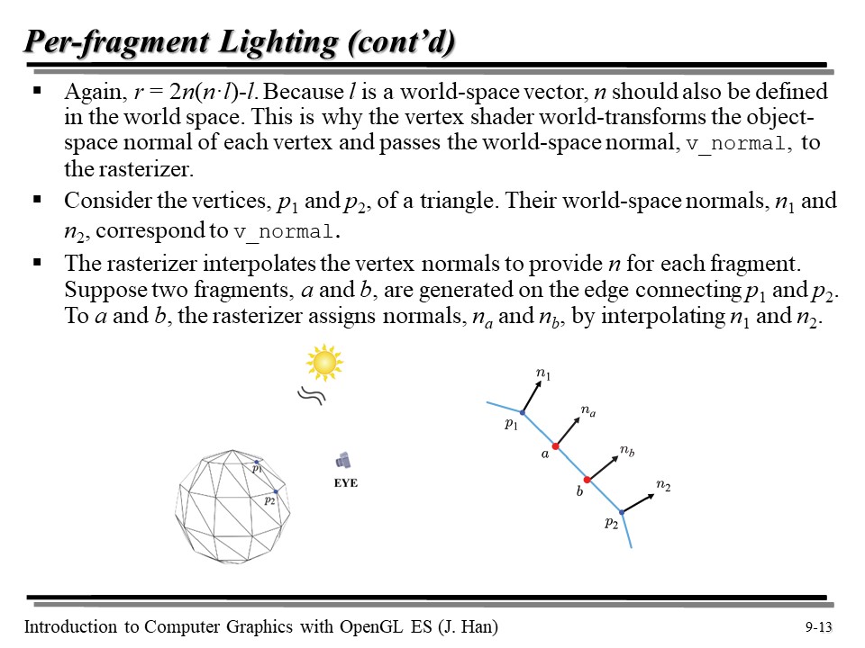 그런데, l 은 사실 World Space 에서 정의된 벡터이다. 즉, 위의 그림에서 점 p1 과 p2 에서 정의된 Object Space 에서의 normal 은 Vertex Shader 에 의해 World Space 로 변환되어야, 비로소 Fragment Shader 가 이를 활용할 수 있다.