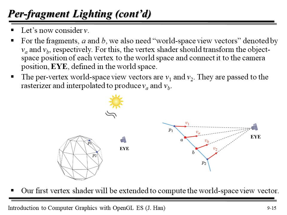 자, 그럼 위에서 래스터라이저가 a, b 점에 대해 View 벡터까지를 전부 계산해서 Fragment Shader 에게 넘겨줄 것이다.