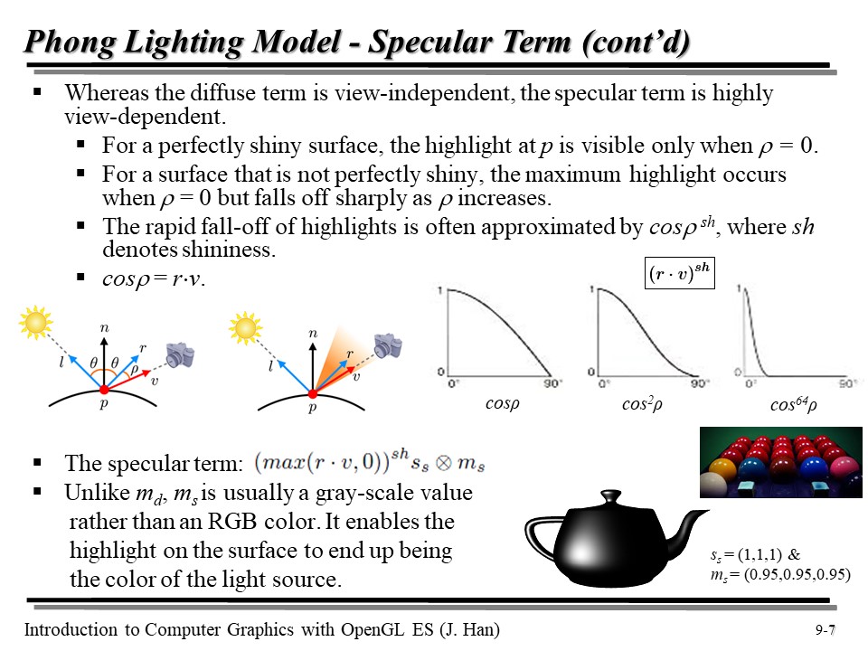 Diffuse 는 정반사, Specular 는 정반사이다. Specular term 은 표면을 highlight 를 통해 빛나게 보이는데 사용되며, 이 때 reflection vector(r) 과 view vector(v) 를 필요로 한다.