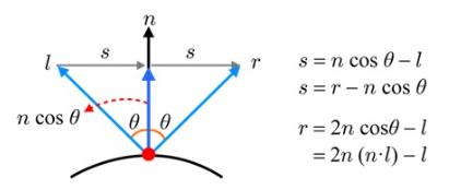 뭐... 풀어 설명하자면, l 과 n 의 크기는 같은데... 중앙의 진한 파란색 벡터는 n cos θ 라고도 표현할 수 있다. l 벡터의 끝에서 해당 진파란색 벡터의 끝으로 가는 벡터는 n cos θ - l 인데... n 벡터와 대칭되게 삼각형이 하나 더 그려지게 된다(입사각 = 반사각이므로). 이때의 s 는 n cos θ 벡터의 끝에서 r 까지이므로, r - n cos θ 로 표현이 가능하다.
