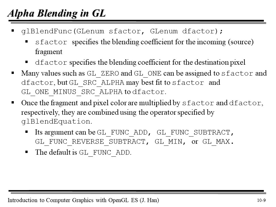 glBlendFunc 에서의 첫 원소는 파란색 삼각형, 두번째 원소는 빨간색 삼각형의 알파값이라고 보면 된다.