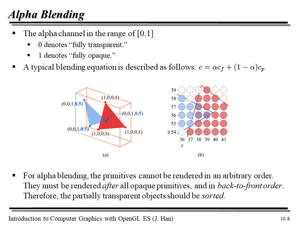 3. 알파 블렌딩(Alpha Blending) 을 이용하면 투명한 오브젝트들이 겹쳐져 있는 경우, 색상을 보간을 통해 합리적으로 표현할 수 있다. 이때, 렌더링되는 순서는 뒤에서 앞(back-to-front)이어야 한다!