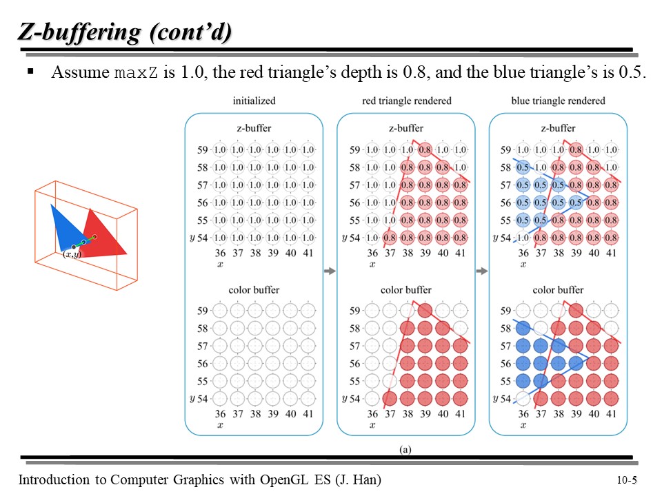 (x, y) 점에 있는 fragment 는, 동일한 (x, y) 좌표에 있는 다른 fragment 들과 비교하여 z 좌표 값이 작을 경우 출력되고, 그렇지 않을 경우 버려진다.