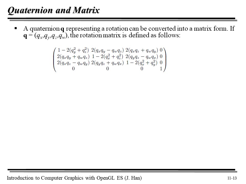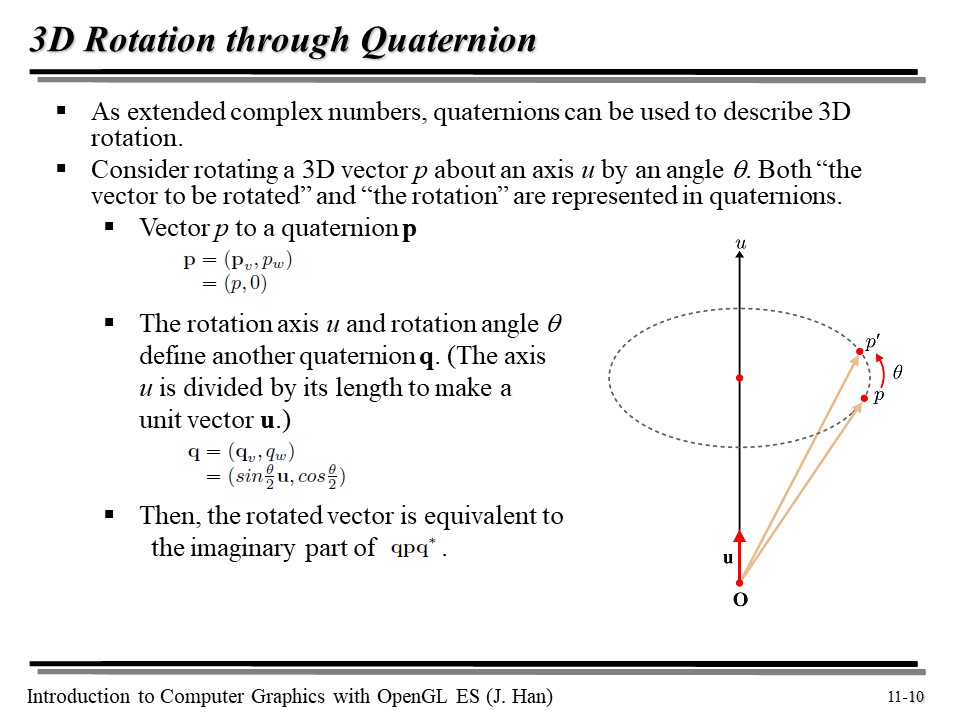 3. 쿼터니언을 이용하면 임의의 축에 대해 𝛉 만큼의 각도로 점/벡터를 회전시키는 회전 행렬을 쉽게 만들어 낼 수 있다(qpq*). 그리고 쿼터니언 사이의 보간도 가능하다!
