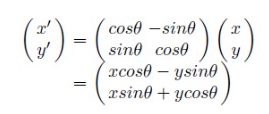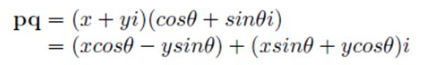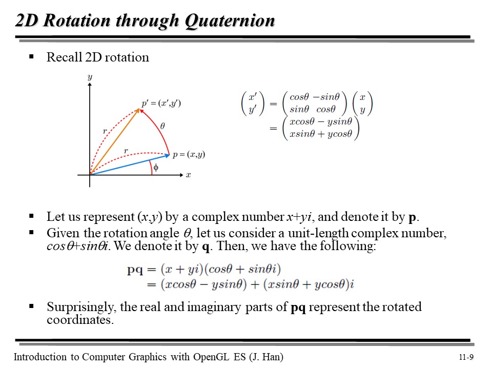 (x, y) 를 x + yi 라고 놓고, 이를 p 라고 정의한 다음, 𝛉 각만큼 회전시키는 unit 사원수를 cos𝛉 + sin𝛉i 라고 정의한 후 q 라고 하자.