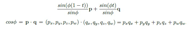 쿼터니언 p 와 q 를 곱하면, 내적과 같은 결과가 나오는데... 아크 코사인을 취하면 Φ 값을 구할 수 있다. 아, 그때의 Φ 값은 물론... t 에 따라 달라질 것이다. 예를 들어, t 가 0.5 일 경우에는, 0.5 * Φ 값을 위의 보간식에 넣으면 된다 😉