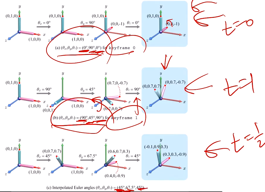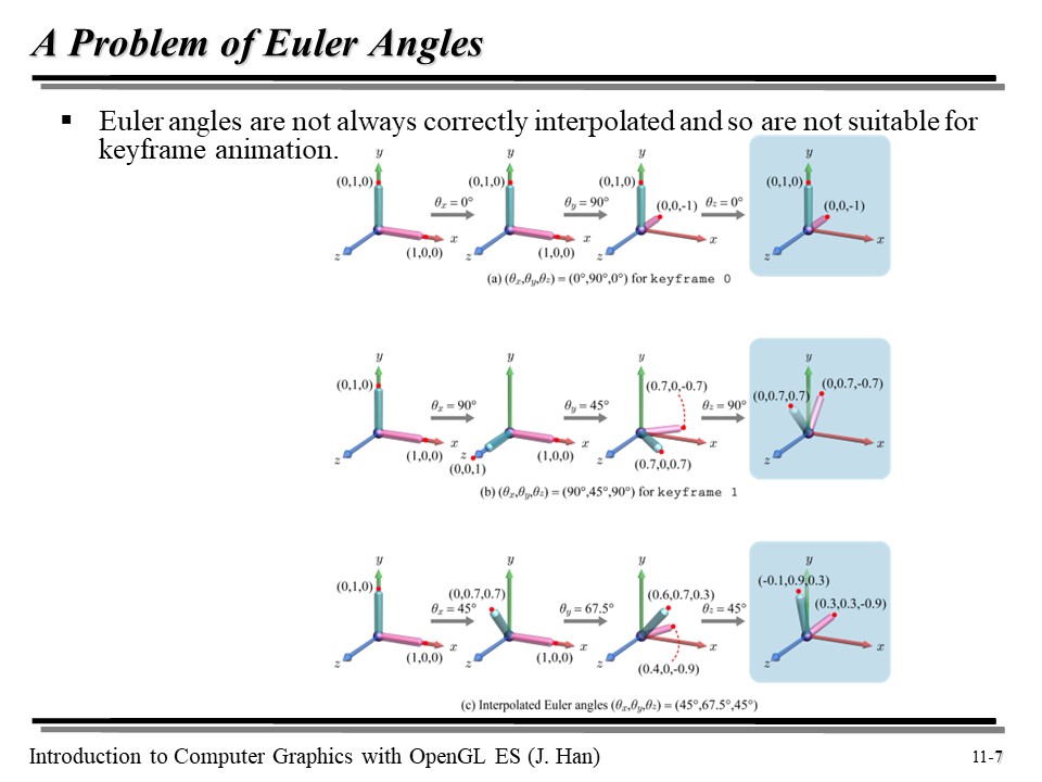 그런데 오일러 각은 항상 정확하게 보간이 되지는 않으므로, 키프레임 애니메이션에 사용하기에는 적합하지 않다.