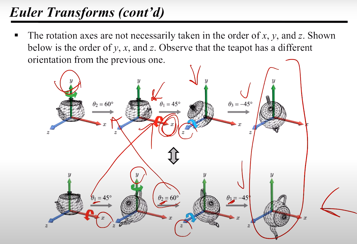 1. 오일러 변환은 주 축(Principal Axes)을 기준으로 일정 각도의 회전을 연속적으로 적용할 때 사용할 수 있다. 그런데 오일러 변환의 결과값은 교환법칙이 성립하지 않는다.