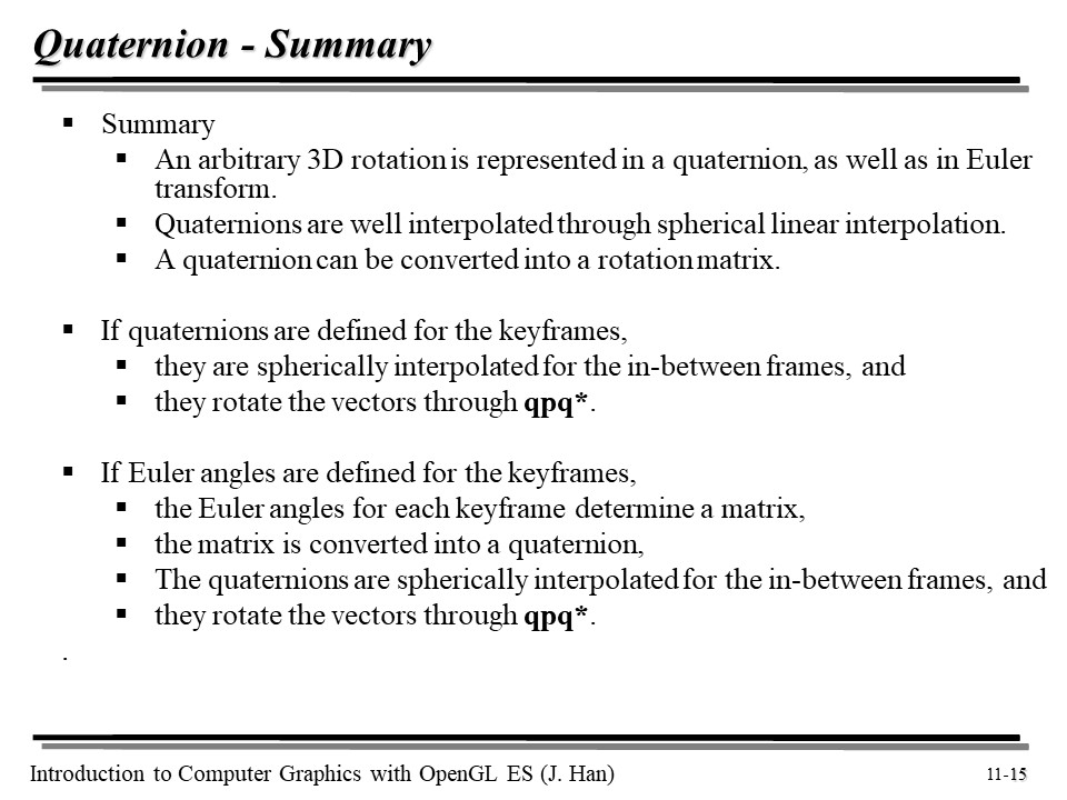 요약을 하면, 임의의 3D 공간에서의 회전은 쿼터니언과 오일러 변환으로 표현될 수 있다. 쿼터니언은 원에서의 선형 보간으로 표현될 수 있으며, 회전 행렬로 변환될 수 있다.