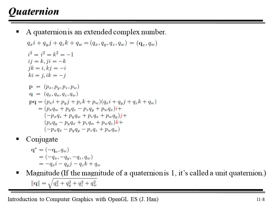 그 대안이 바로 쿼터니언이다. 쿼터니언은 복소수를 확장한 녀석이다. 이때 qw 는 실수부, 나머지는 허수부이다. 이를 사원수라고 부르기도 한다.