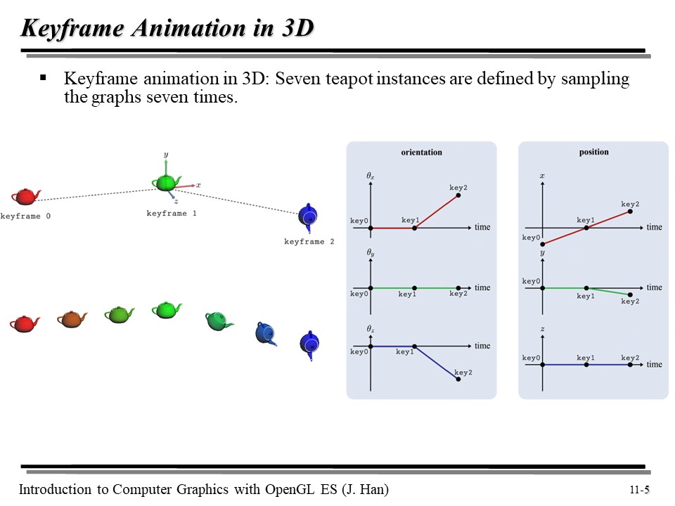 위의 주전자를 보자. 키프레임 0 에서 2 까지 가는 과정에서 샘플링된(보간된) 주전자 그림들이 그려지고 있다. 위 방식은 방향과 위치에 대해 선형 보간한 결과값들을 보여준다.