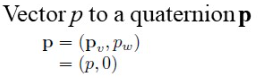 점 p 가 (x, y, z), p' 가 (x', y', z') 라고 하자. 먼저, p 를 이용해 쿼터니언 p 를 정의하겠다.