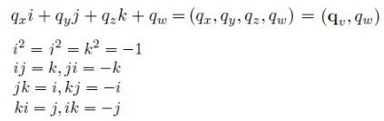 그 대안이 바로 쿼터니언이다. 쿼터니언은 복소수를 확장한 녀석이다. 이때 qw 는 실수부, 나머지는 허수부이다. 이를 사원수라고 부르기도 한다.