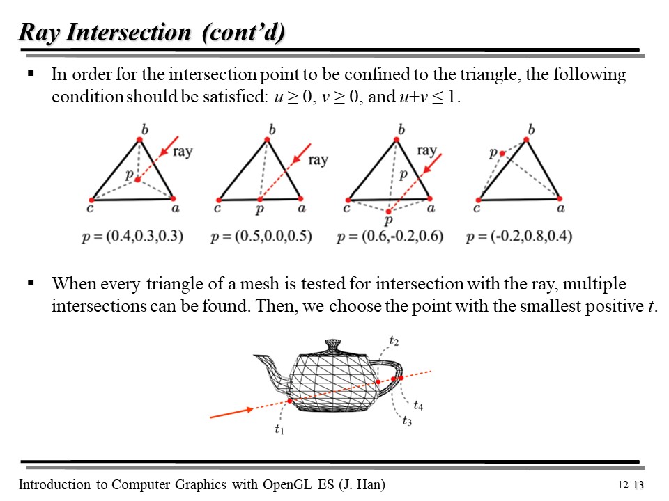 교차점 p 가 삼각형 안에 있으려면, u >= 0, v >= 0, u + v <= 1 의 조건을 만족해야 한다. 그래야만 상대적 무게값을 고려해 봤을때 p 가 안에 존재할 것이다.