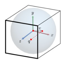 자, 위에서, 스크린 위의 점 q 를 원에 projection 시키고, 원점으로부터 해당 점까지의 벡터를 v 라고 하자.