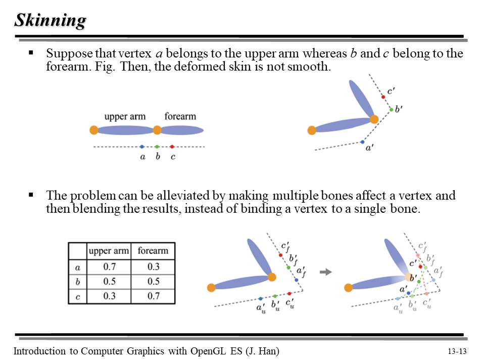 그런데 사실 피부와 뼈는 일대일 대응관계가 아니다.. upper arm 에 있는 피부는, forearm 에 있는 뼈의 움직임에 영향을 받는다 😅 (뼈 위에 있는 점 a, b, c 를 보면, 뼈가 굽어졌을 때, 보간이 필요하다는 것을 확실히 알게 해 준다)