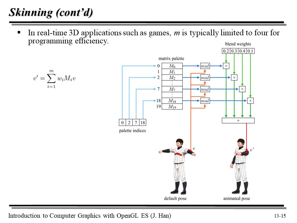 실제로, m 의 갯수 (한 점에 영향을 주는 뼈의 갯수)는 일반적으로 4 정도로 제한된다. 모든 뼈에 대해 행렬식을 계산을 해야 한다고 하면 일이 매우 복잡해질 것이다.. 🙂